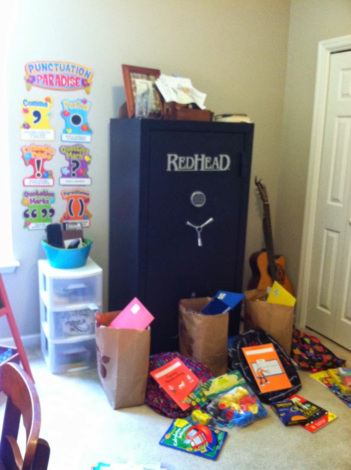 I’ll start with a few snapshots of our office/home school room/ Ryan’s hunting closet and safe-room. For the past three years I did not have a dedicated room for home school stuff. I’ll stick to my guns and say for sure that you do not need a room. I used a small downstairs closet to store nearly everything that is now in this room. We worked at the kitchen table, the kitchen island, the den floor and at this desk (pictured) tucked away in the corner of our laundry room.
