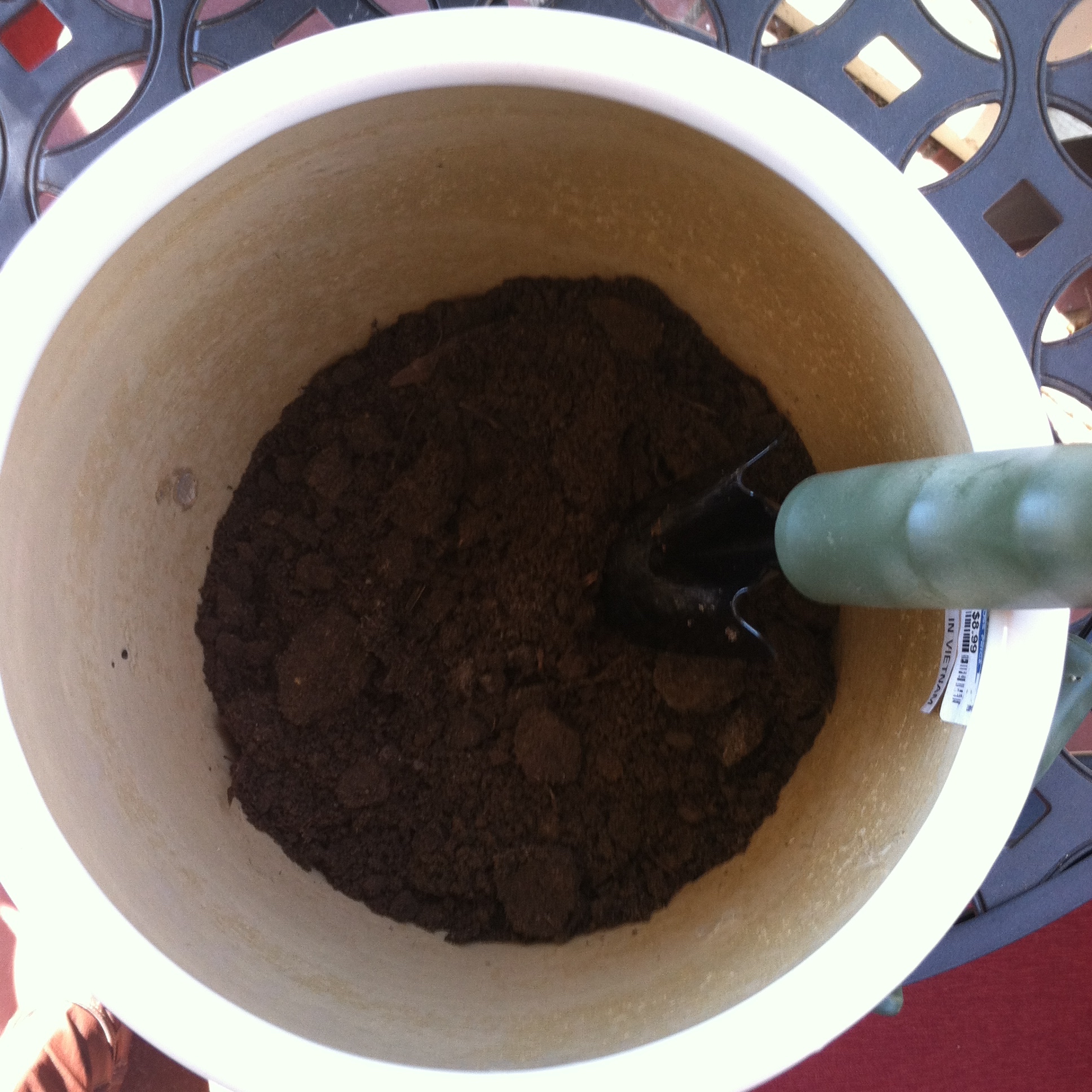 I’m hoping and praying that he’s right. I layered some rocks on the bottom of the planter to act as a drain system and added some fresh outdoor soil and loosened the limp plant from the plastic container it came in.