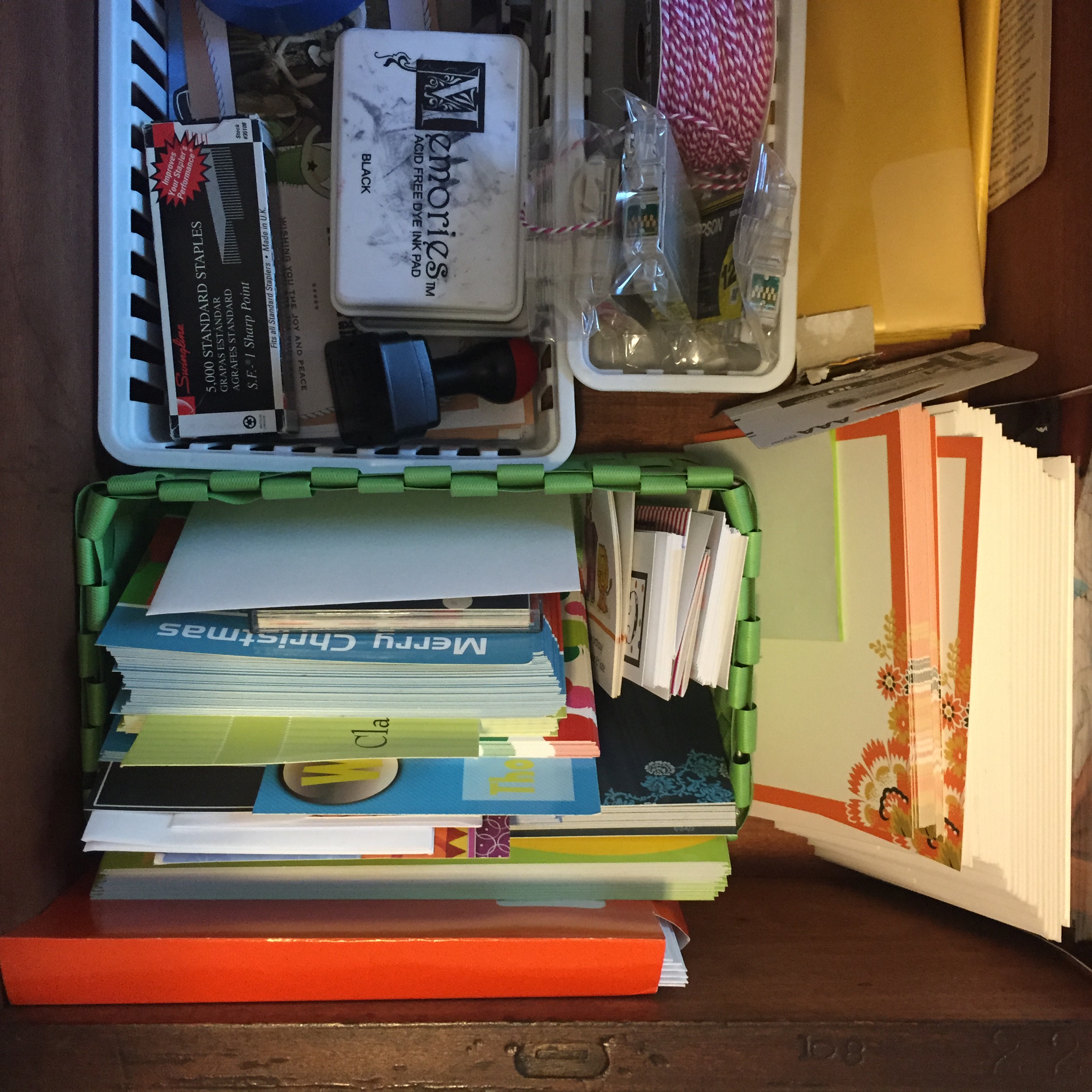 In addition to stationery (flat and folded), I keep good pens and postage stamps on hand at all times.Every time we move, I treat myself to a new, fun return address label stamp. It’s important that my kids know where to find what they need when they are ready to write. I keep it all in a drawer in our office/