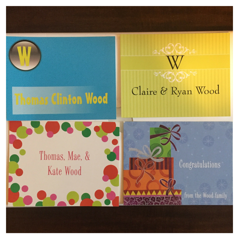 I keep us loaded down with fun stationery. I ordered all of these 4×6 cards from Vistaprint for nearly nothing several years ago. They are blank on the back and we use these for sending postcards and as enclosure cards for gifts.