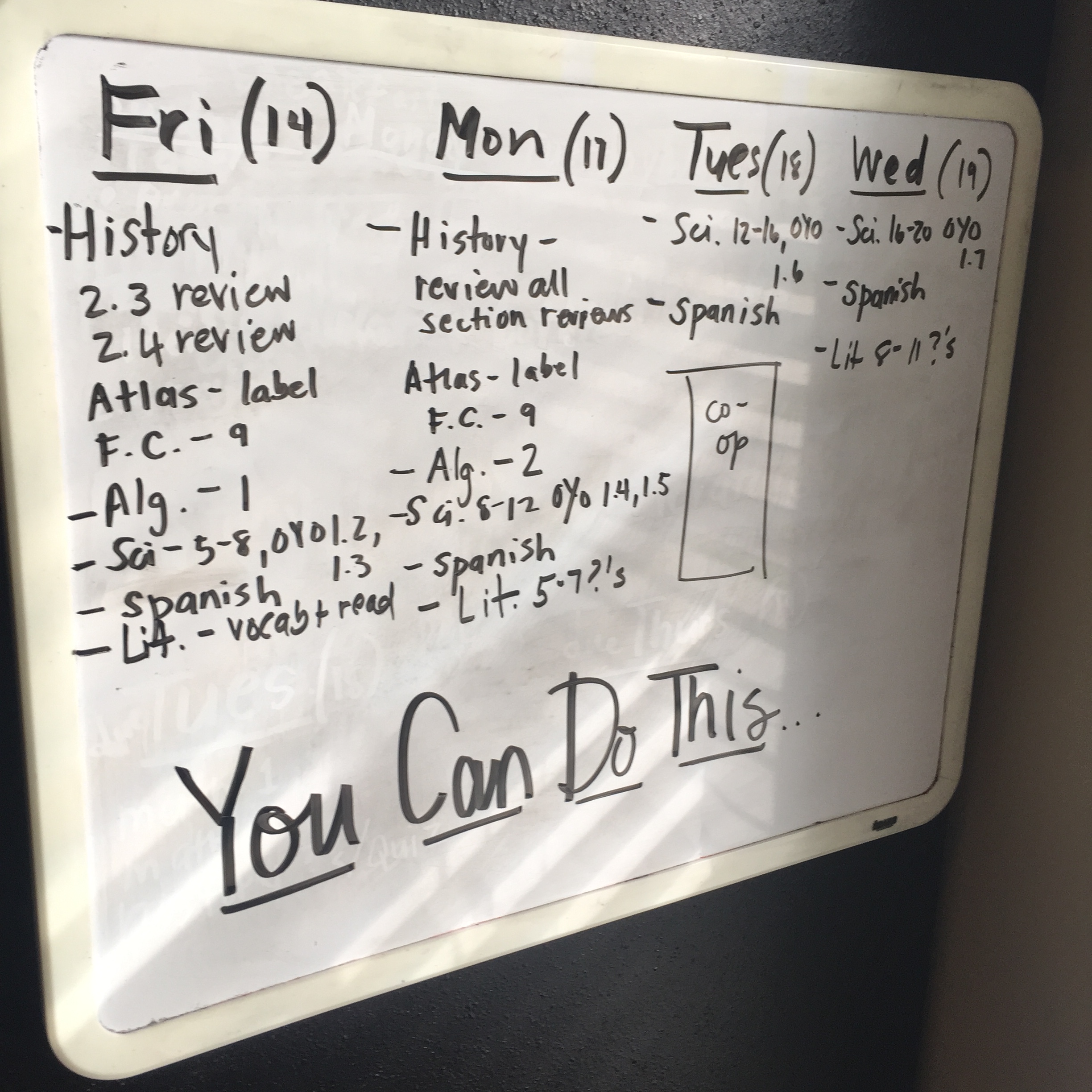 In addition to his planner, Thomas is utilizing a simple dry erase board near his desk in his room. He’s having to spend some time (with my guidance) trying to figure out what work he needs to do which days in order to be caught up for his Tuesday and Thursday classes. He has considerably more work this year as a middle schooler and this skill of time management is vital. I believe it is so helpful to have a visual reminder of what you need to do. Also, marking off or erasing completed items….pure delight!!!