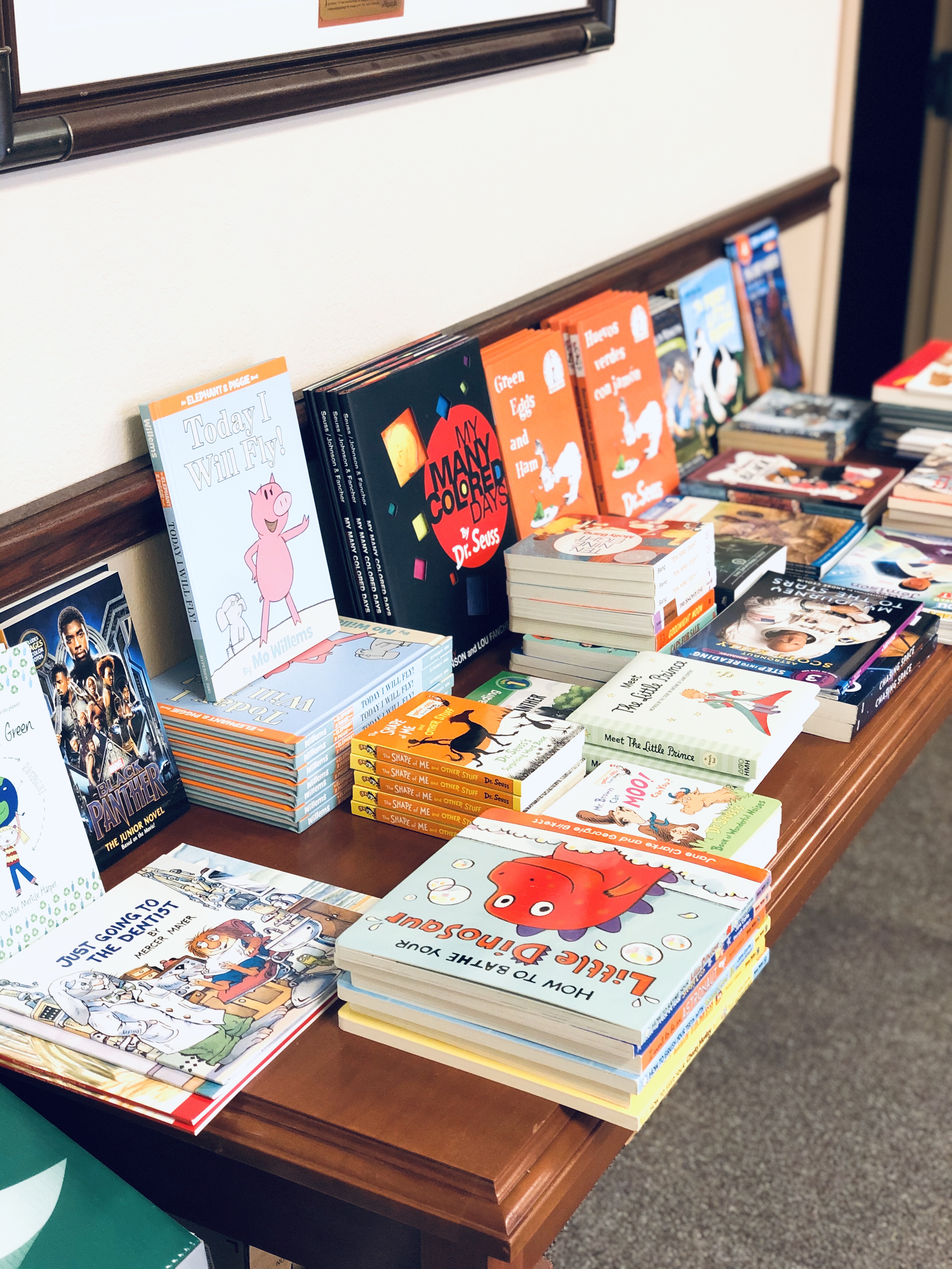 The day before our first event, Ryan and I spent a few hours setting up our recording area at his office building. Channeling my inner bookstore employee, I gleefully displayed over 100 books, making them visually appealing by revealing their bright covers, inviting titles– all for a wide variety of age ranges and interests.