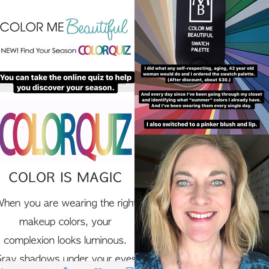 This year, for me that included going down a rabbit hole into a previously popular concept called Color Me Beautiful. The idea is that depending on your hair, eye, and skin tones each person falls into one of four “seasons,” that determine which colors make you look and feel more vibrant.