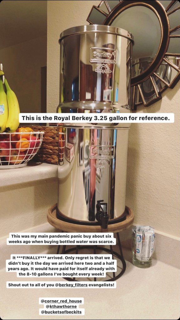 I’ve heard about the wonders of a Berkey for years from faithful devotees, but couldn’t really justify the price or the counter space. All that changed when we could no longer procure bottled or gallon jugs of drinking water during the early days of the pandemic.