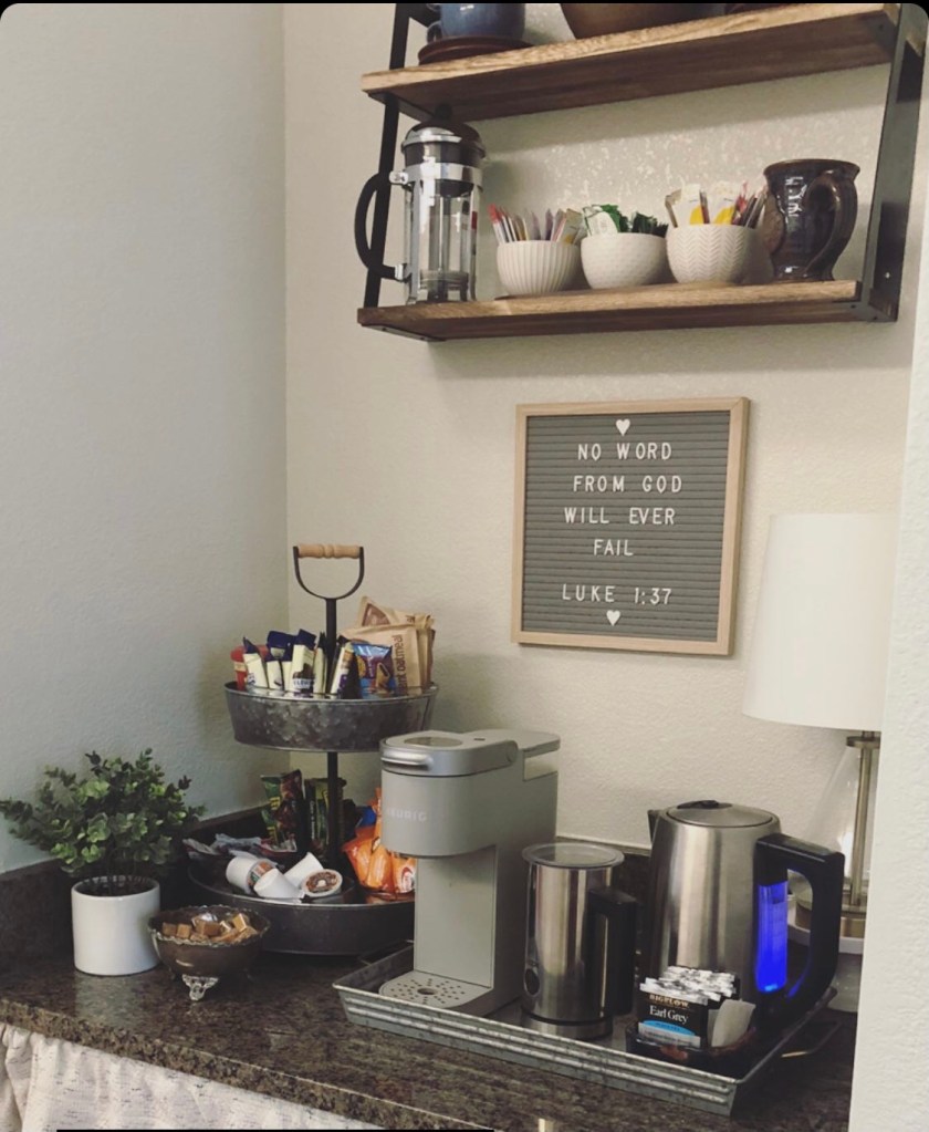 Our drink station is one of my favorite (and most used) areas of our house here. Under the counter is a small shelf where our kids keep their lunchboxes, laptops, and all of their phones/chargers plugged up. Above we have constant and pretty instant access to tea, coffee, and other hot drinks. Not only do we utilize this as a family, it is “always ready” for unexpected company. Living on a military installation there’s always someone stopping by. I love being able to offer a drink to a friend or neighbor at a moment’s notice.