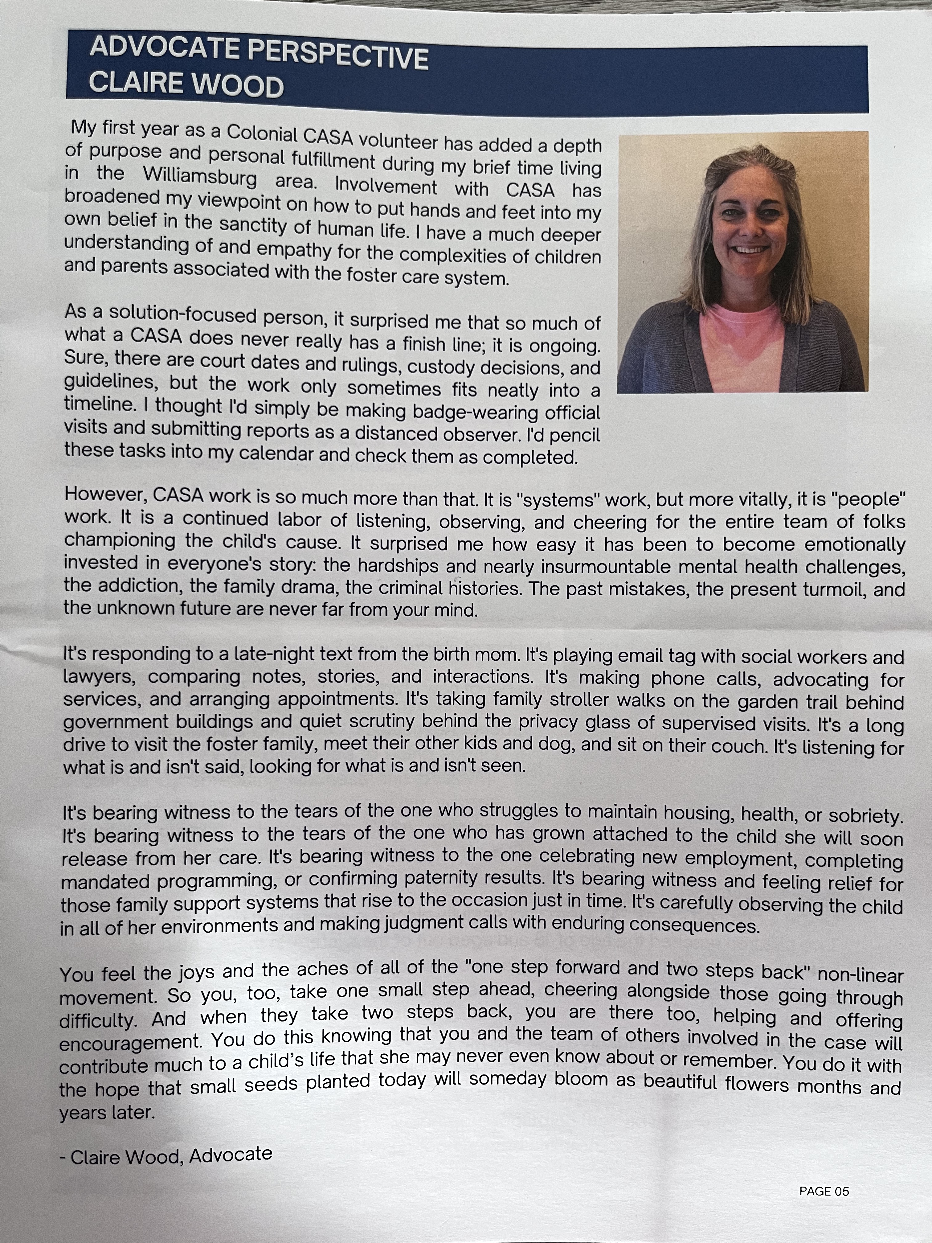 (Below is something I wrote that was featured in Colonial CASA’s Annual Report.)