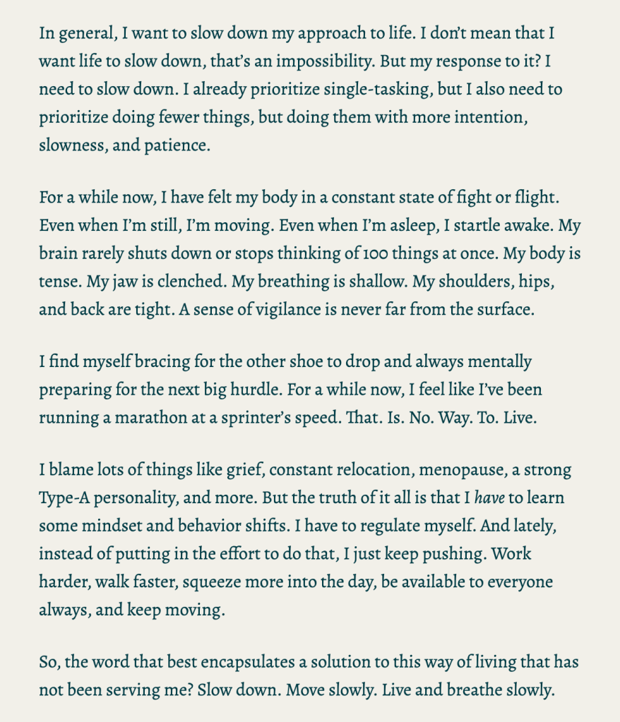 - “It’s not that my days are empty. I still do a lot. I just don’t do it like I’m late for my own life. Everything gets to take the time that it takes.” (A quote I read somewhere.)